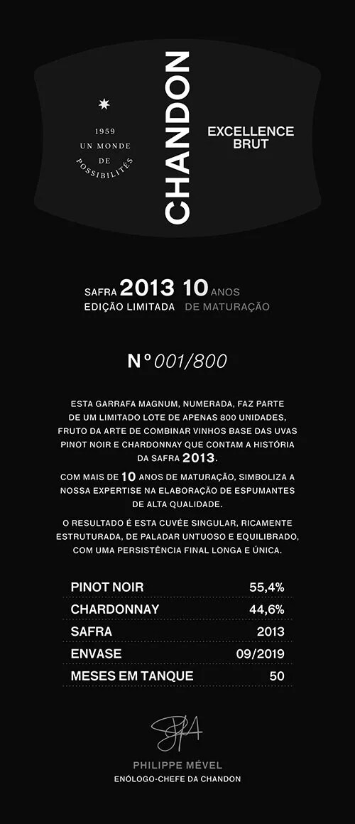 Chandon Excellence Magnum - Safra 2013 faz parte de um lote de apenas 800 unidades fruto da arte de combinar vinhos base das uvas Pinot Noir e Chardonnay que contam a história da Safra 2013.